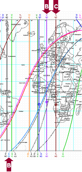 Aus den Ergebnissen ist abzuleiten, daß die Frau vom Aszendenten her in den Orbis des Gruppenschicksalspunktes von Merkur-Saturn fällt, die Abweisung. Dies bestätigt sich durch die in der Realität erlebte Isolation. Das Ergebnis Sonne zu Ortsqualität fällt in die Nähe des Milieuwechselpunktes von Venus-Merkur, was mir trotz des weiten Orbis aussagefähig für die Erlebnisse an diesem Ort ist. Das Ergebnis von MC zur Ortsqualität fällt auf einen Gruppenschicksalspunkt von Sonne-Uranus, was insbesondere auf den lebensgefährlichen Zusammenbruch hinweist. Da die Beziehung MC-Ort Sonne-Uranus-Qualität hat und gleichzeitig das Relokationshoroskop zeigt, daß an diesem Ort nur der zweite Anlageteil aufscheint, der Schütze-Aszendent jedoch nicht mehr, habe ich der Frau geraten, irgendwann noch einmal den Wohnort zu wechseln, wenn es sich über einen äußeren Anlaß für sie fügt. In der Astrokartographie zeigt sich die Linie MC-Saturn am Aufenthaltsort. Die mit der Relokation des Horoskops darüber hinaus möglichen Aussagen fehlen hier. ********************* Astrokartographie